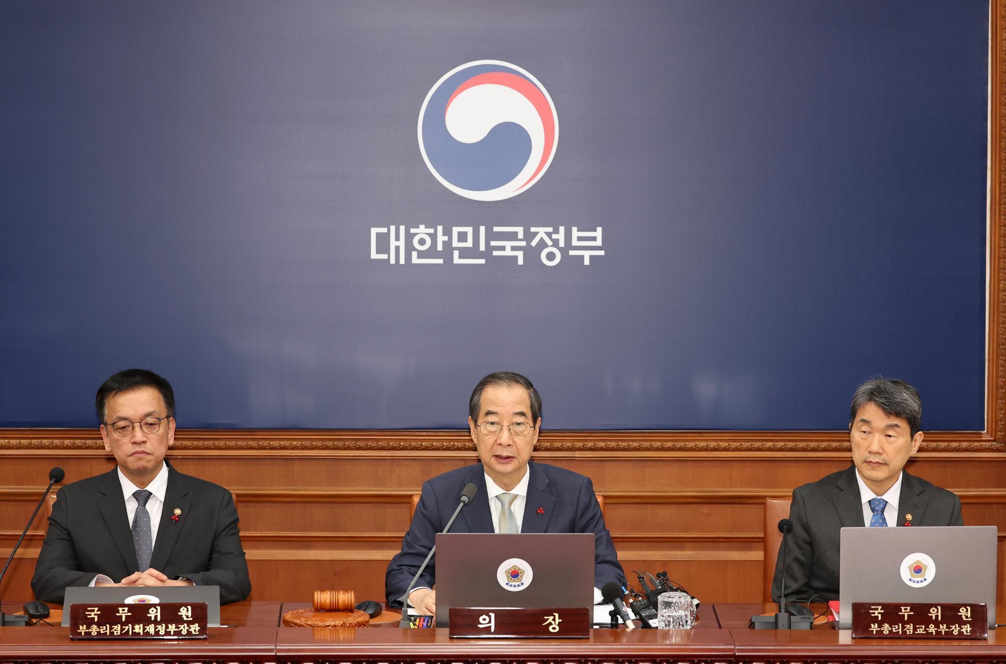 2024年12月14日,在韩国首都首尔,代行总统职权的韩国国务总理韩德洙(中)召开临时国务会议。新华社/纽西斯通讯社双方庭上口头陈述当天结束,但宪法法院没有设定裁决日期。韩联社报道援引法律专家说法称,宪法法院可能需要大约两周或更长时间审议,宣布裁决的时间有可能在3月份。
